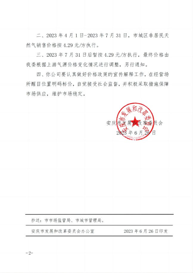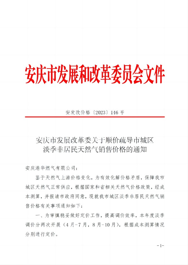 安慶市發(fā)展改革委關(guān)于順價疏導(dǎo)市城區(qū)淡季非居民天然氣銷售價(2023)格的通知