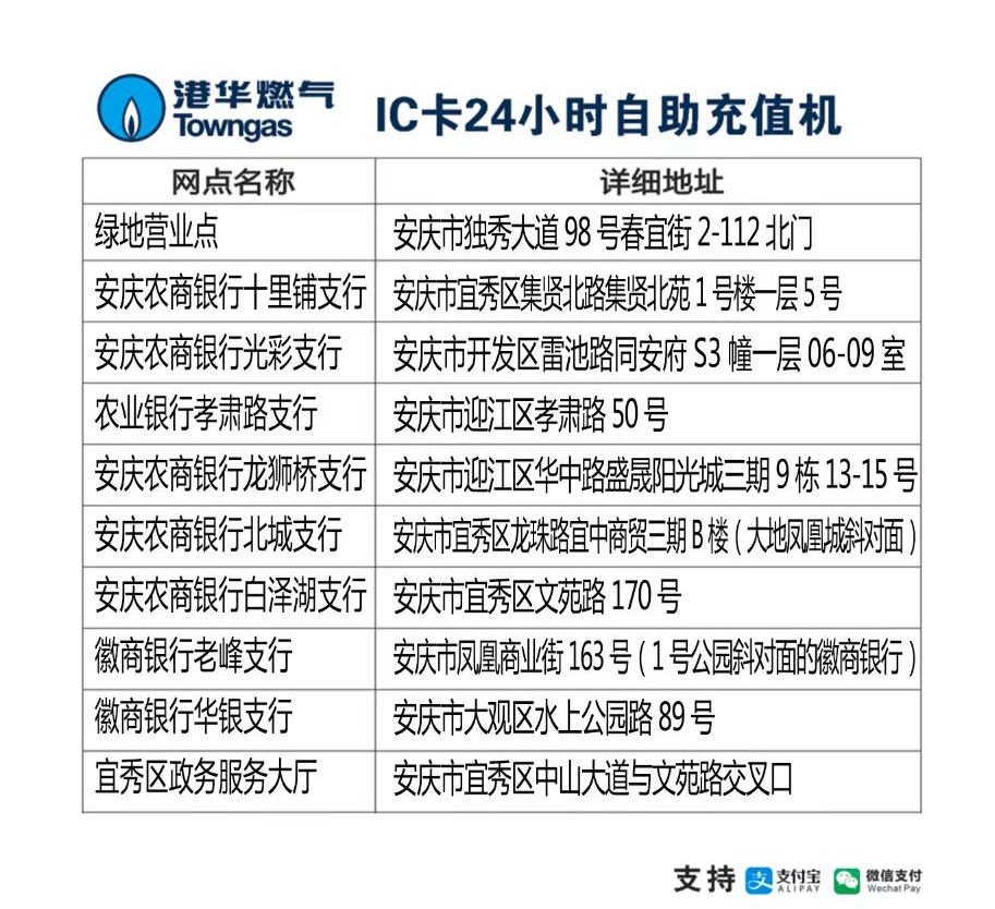 目前我公司支持交通銀行、徽商銀行、郵政儲蓄銀行、工商銀行、農(nóng)業(yè)銀行和浦發(fā)銀行的網(wǎng)上銀行和手機(jī)銀行,以及移動“中國移動”、電信“翼支付”、我公司微信公眾號和在“微信”-“生活繳費”、“支付寶”-“生活繳費”中查詢?nèi)細(xì)赓M并繳納欠費或預(yù)存氣費。