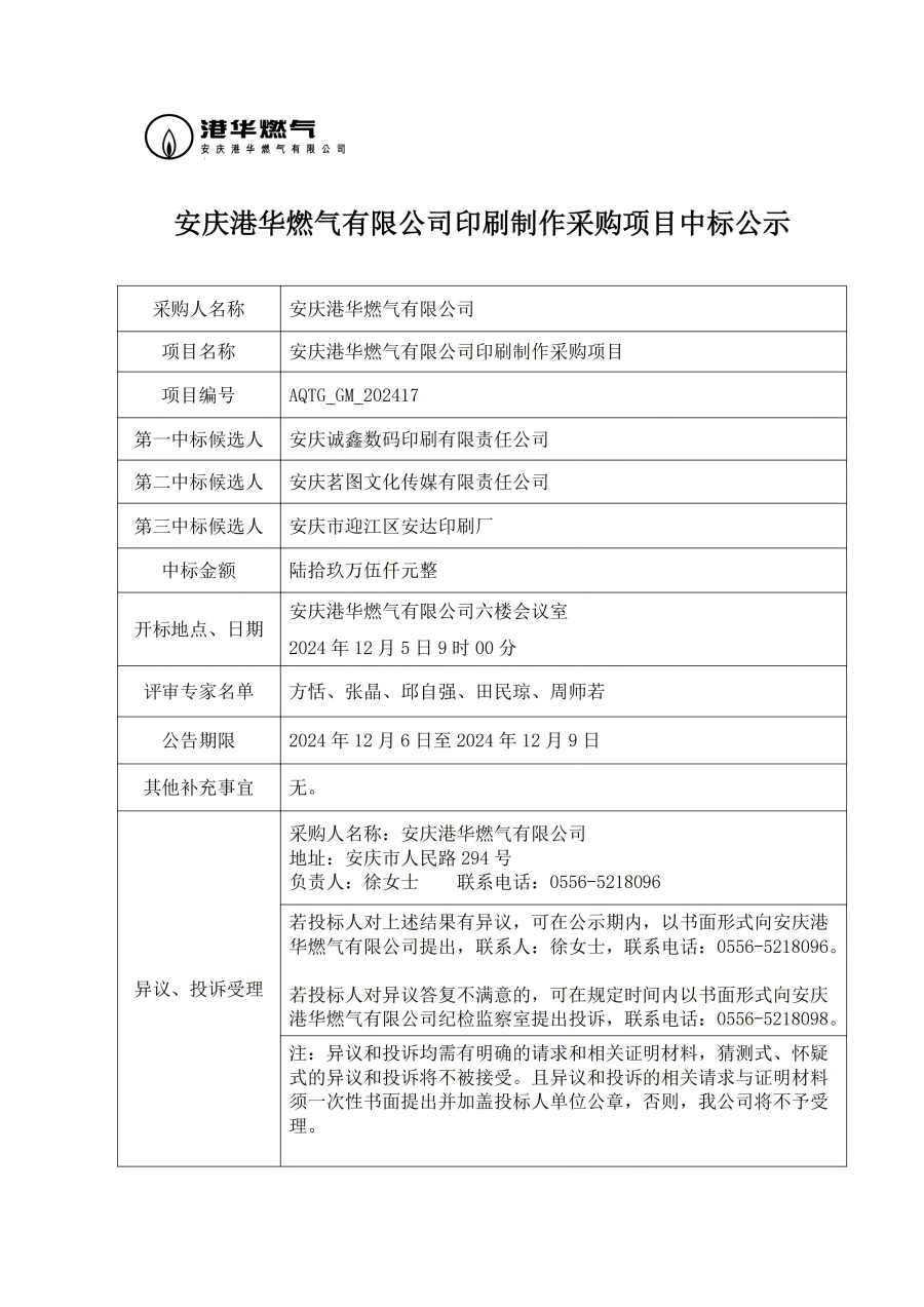 安慶港華燃?xì)庥邢薰居∷⒅谱鞑少?gòu)項(xiàng)目中標(biāo)公示