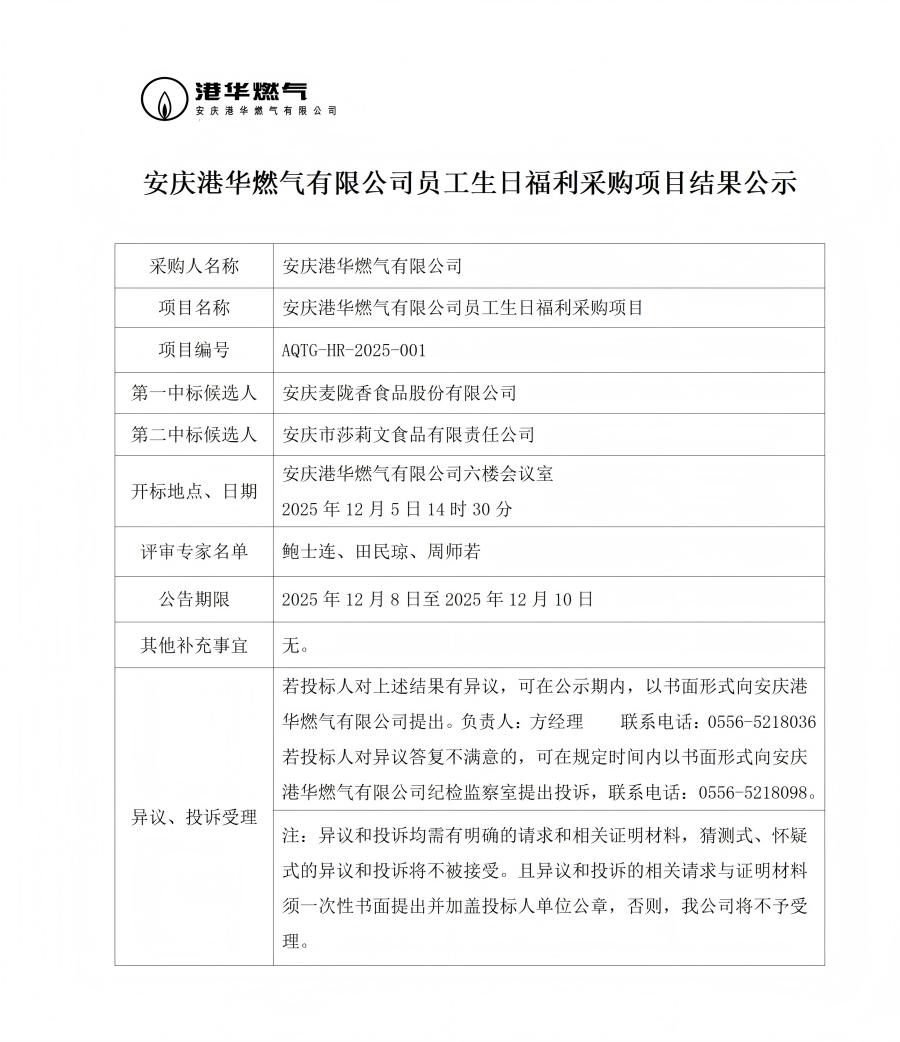 安慶港華燃?xì)庥邢薰締T工生日福利采購項目結(jié)果公示