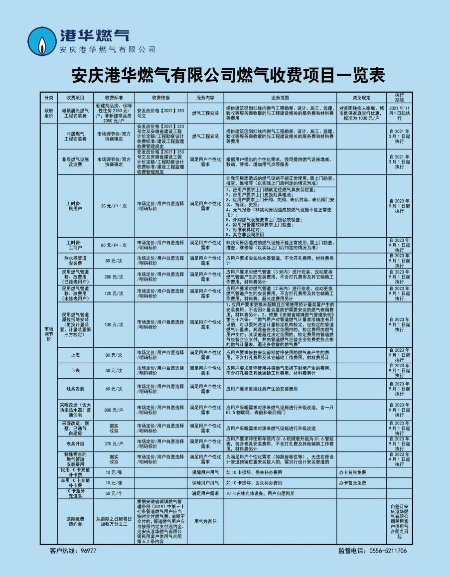 安慶港華燃?xì)庥邢薰臼召M(fèi)項目一覽表(2023)